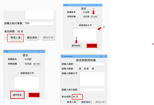 本專案的發案方希望設計一個軟體可以由他們授權時效並且具管理權限,也就是可以以管理員身分先將預先輸入內容key in,並又可以讓操作者添加更多訊息,而在完成這一系列操作後自動透過蝦皮的分類器摟尋賣家並開啟聊聊視窗發送統一消息出去,類似廣告推送的功能。